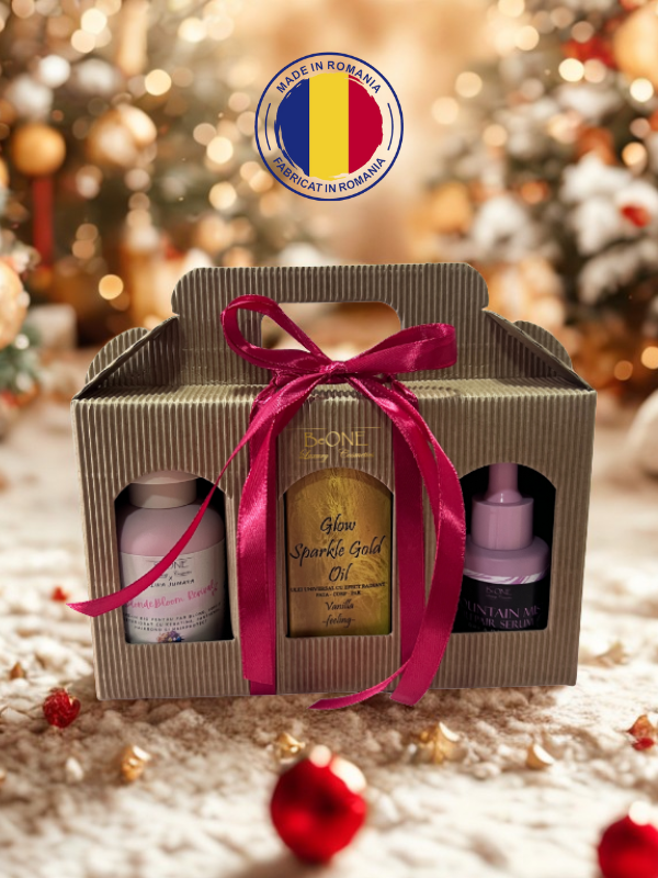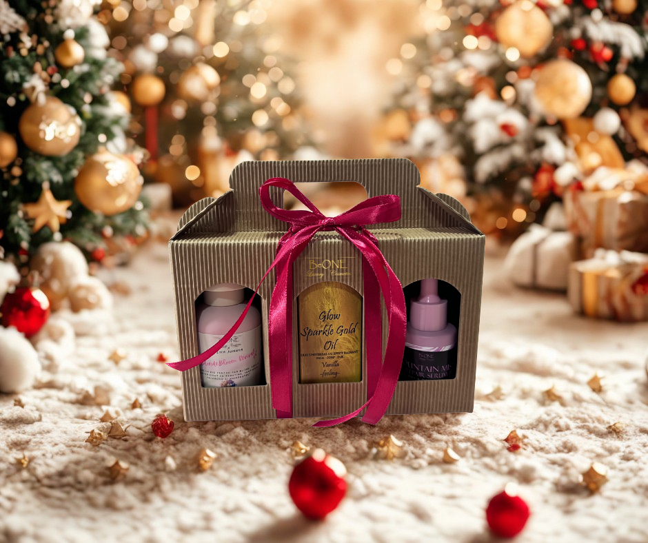 Cutie festivă BeOne Cosmetics, cu trei produse de răsfăț: leave-in pentru păr, ulei hrănitor pentru păr și ulei cu sclipici pentru corp. Ambalată într-o cutie kraft elegantă, cu mâner și panglică decorativă, este un cadou minunat, gata de pus sub brad, ce aduce strălucire și bucurie în sezonul sărbătorilor.