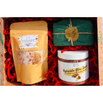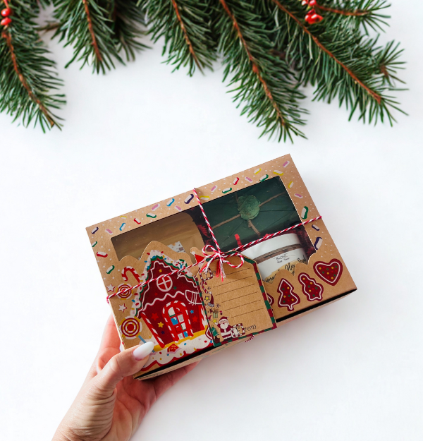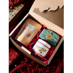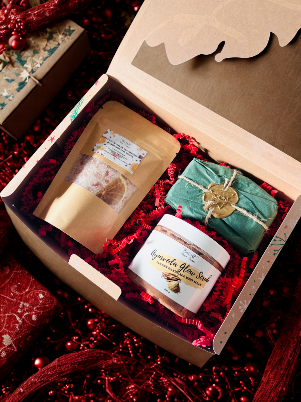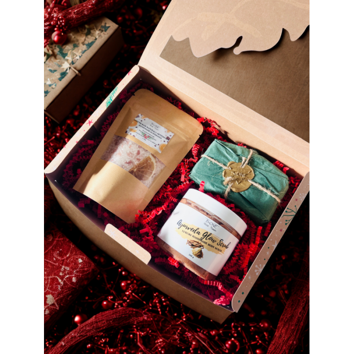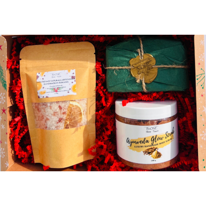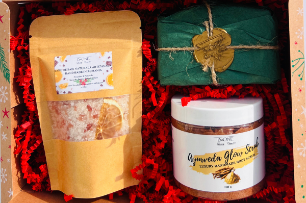 O cutie cadou BeOne Cosmetics în ambalaj kraft festiv, decorată cu panglică și accente de Crăciun, ce conține trei produse artizanale: o sare de baie de 100g cu aromă festivă, un săpun natural și un scrub de corp revigorant. Un cadou natural, elegant și plin de spiritul sărbătorilor!