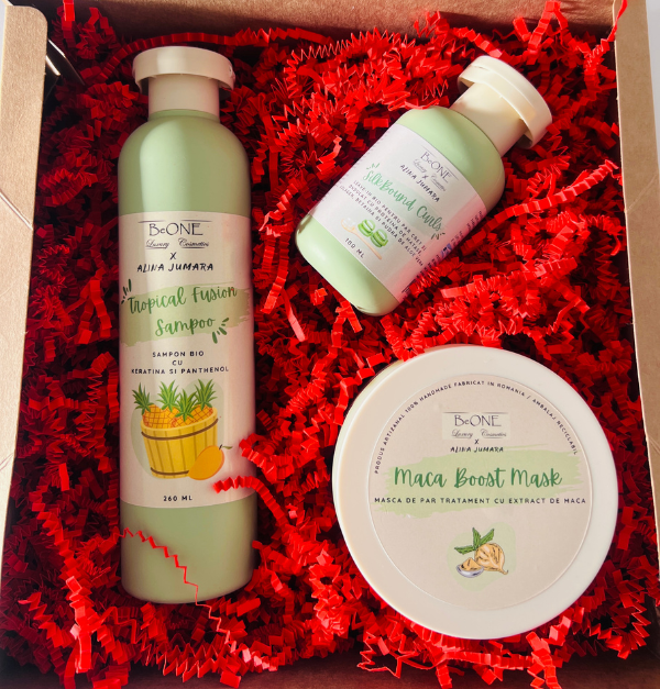 În interior se regăsesc produse naturale, create pentru un ritual complet de frumusețe — șampon hrănitor, mască reparatoare și leave-in hidratant, ce redau părului vitalitatea, suplețea și strălucirea.