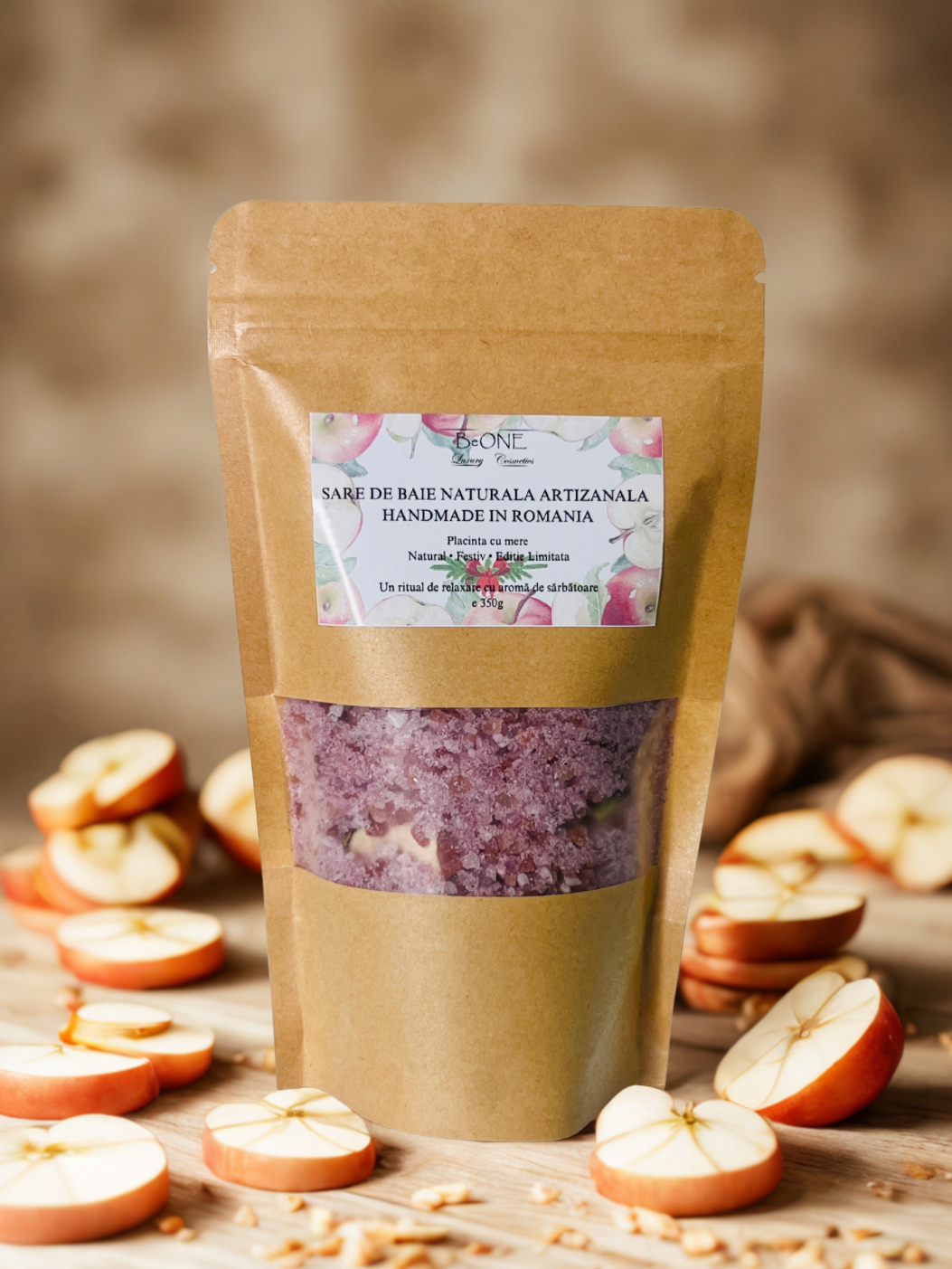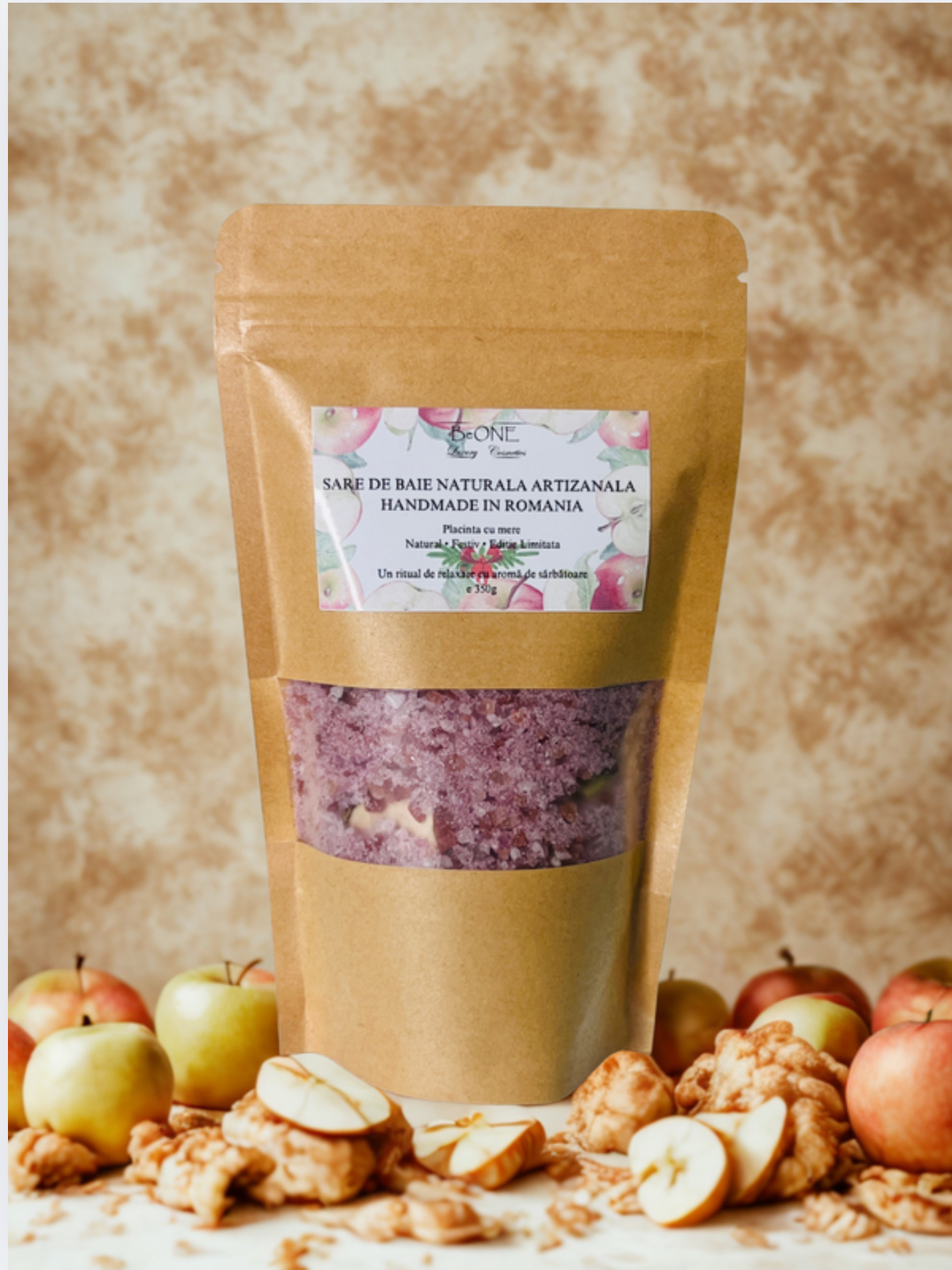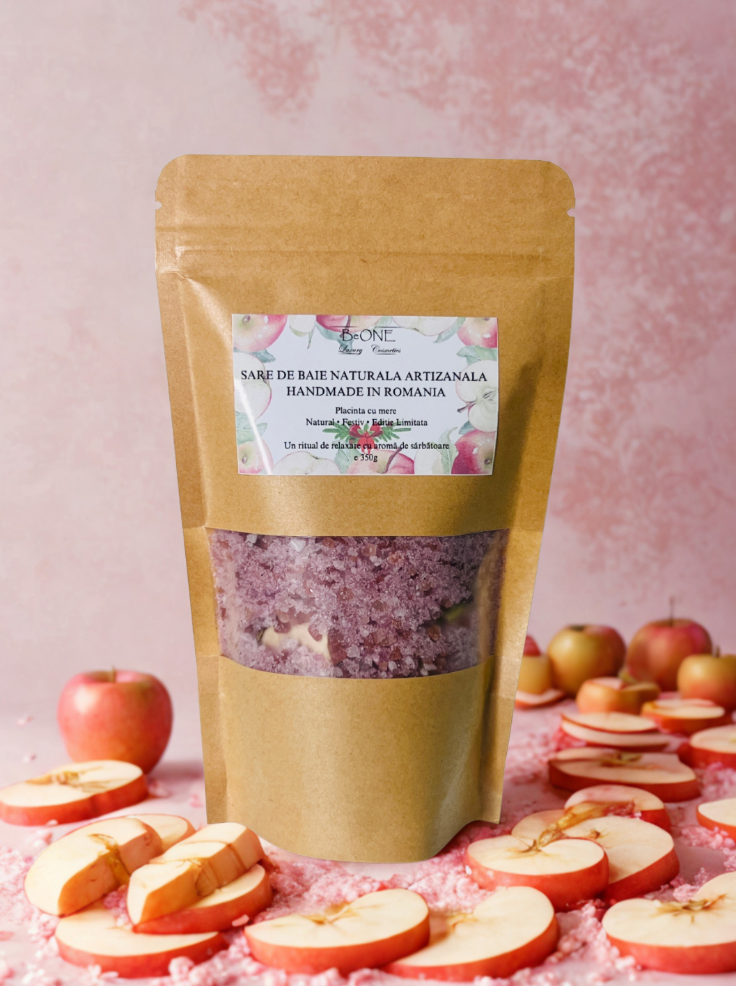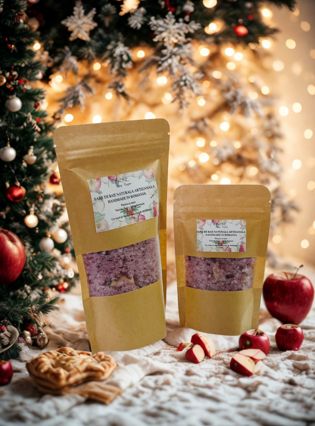 Sare de baie naturală cu aromă festivă de plăcintă de mere, realizată dintr-un amestec de săruri minerale de Epsom, mare și Himalaya. Îmbogățită cu felii de măr deshidratat și pudră de hibiscus, oferă o experiență relaxantă, detoxifiantă și revigorantă, lăsând pielea catifelată și parfumată delicat.